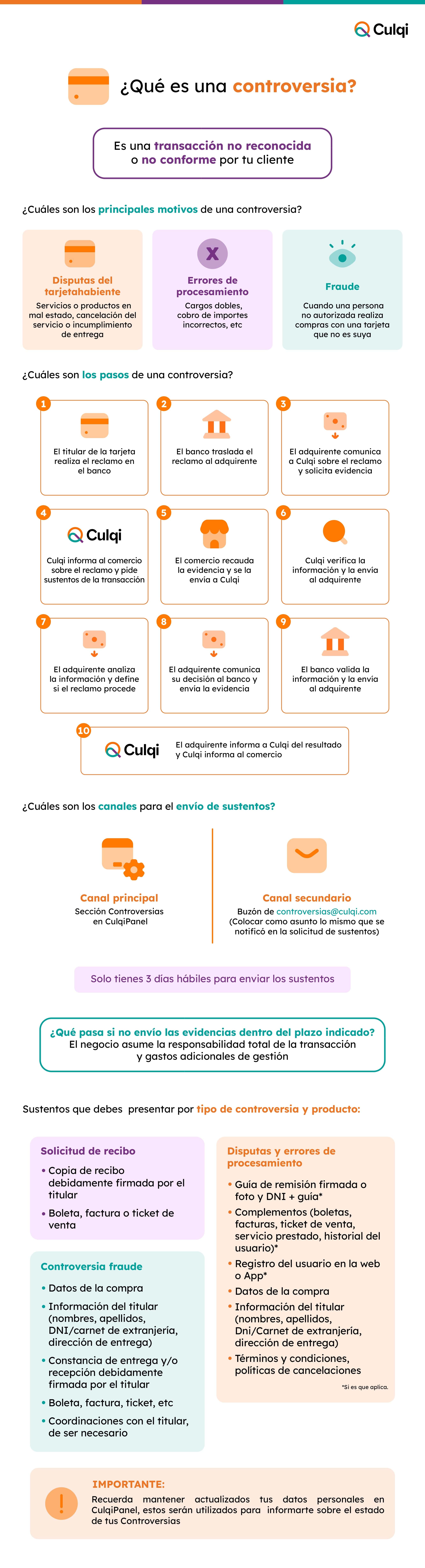 Cualquier otra petición de acceso, modificación o cancelación a puede ser dirigida directamente a la Empresa. Por lo general, la Empresa no modificará manualmente la información personal, ya que resulta muy difícil verificar la identidad de forma remota. Así pues, el Titular de Datos Personales debe de actualizarla lo antes posible si ésta cambia o no es exacta. Conservaremos la información personal de las cuentas cerradas durante un periodo de veinticuatro (24) meses para cumplir la ley, impedir fraudes resolver disputas, solucionar problemas, cooperar con investigaciones delictivas, obligar el cumplimiento de las Condiciones de uso de Culqi y realizar otras acciones que permita la ley.